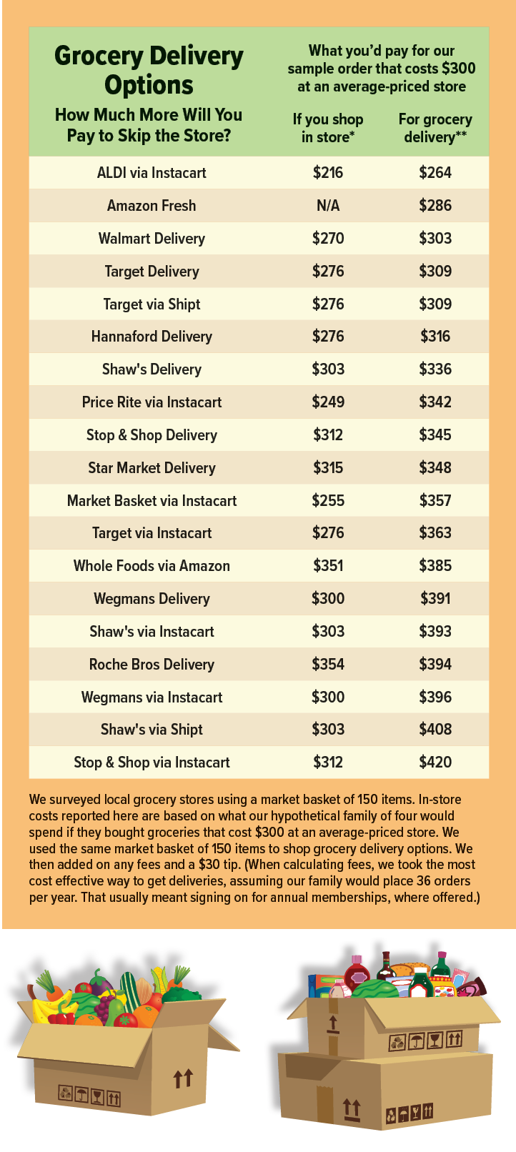 Instacart and Shipt are listed multiple times in our price comparisons because they let customers choose among many different chains where they will send their shopper-drivers to find items you ordered, check out, and bring them to you. So, with Instacart you could make one order for Market Basket and another for Costco (each trip counts as a separate order). When you order via Instacart or Shipt, sometimes store personnel do the shopping and then the third-party service delivers it. Other stores simply allow Instacart’s and Shipt’s workers to shop for clients.