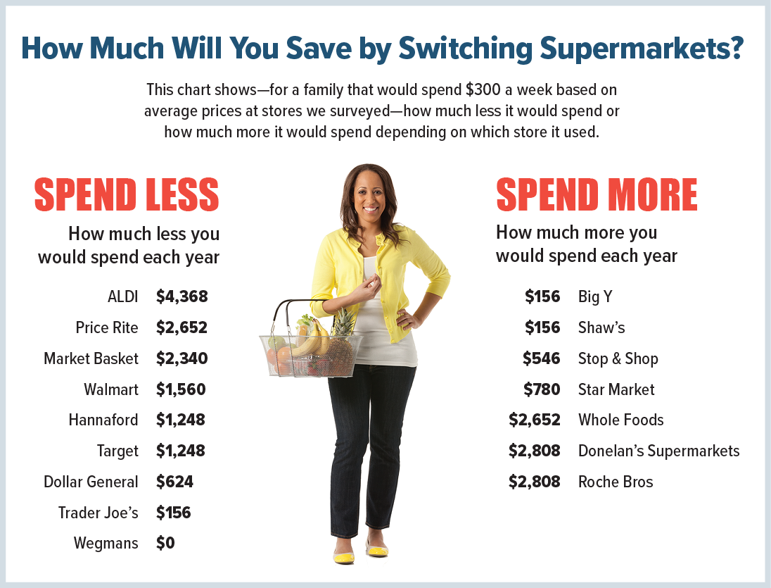 For a family that spends $300 per week at the supermarket, a 17 percent price difference totals savings of $2,652 per year; a 10 percent price difference totals $1,560 a year.