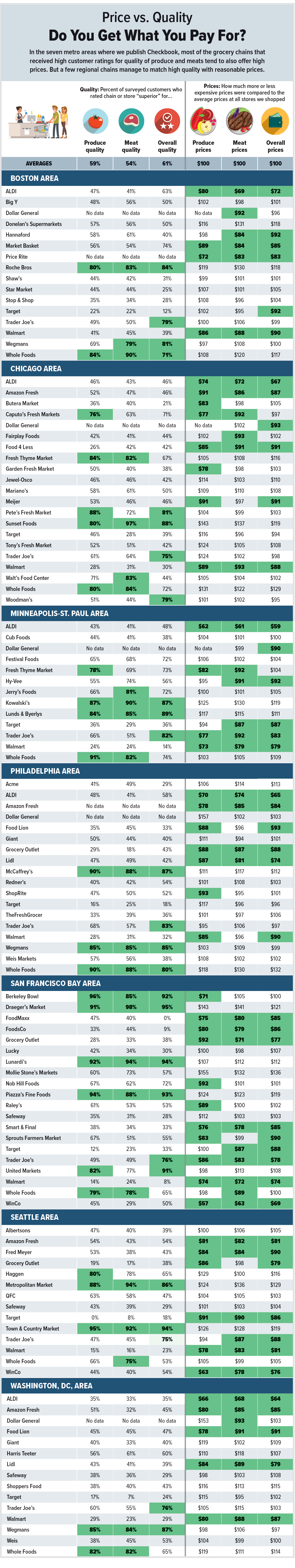 Our ratings of grocery stores report how major U.S. chains stack up for price and quality. To compare prices, our researchers used a market basket of 150 common items to shop grocery-store options in seven metro areas (the Boston, Chicago, Minneapolis-St. Paul, Philadelphia, San Francisco, Seattle, and Washington, D.C. areas). To evaluate stores on quality of products and service, we surveyed area consumers. Here’s a rundown of the results: