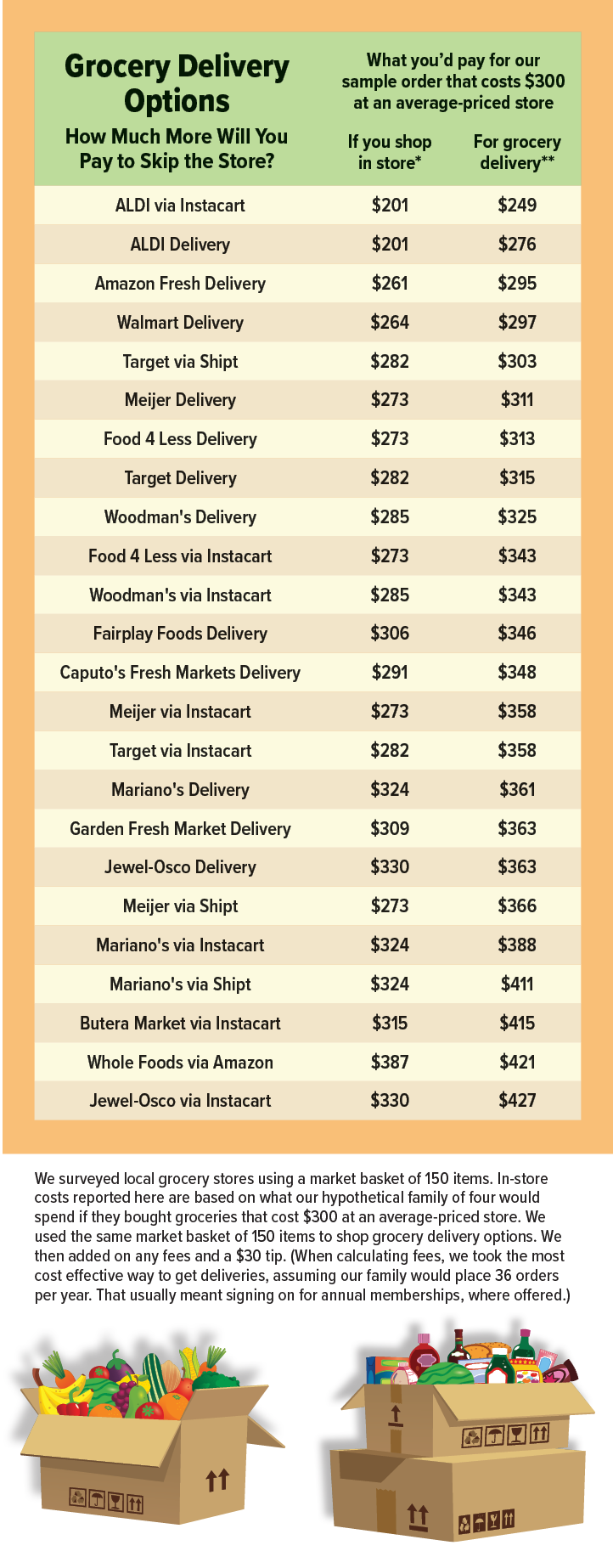 Some stores offer online ordering with at-store pickup. You still have to do the planning and list-making but you can check the quality of produce and meat before leaving the store. We didn’t price out these types of arrangements—we don’t have time to do everything—but several Checkbook staffers love this hybrid option.