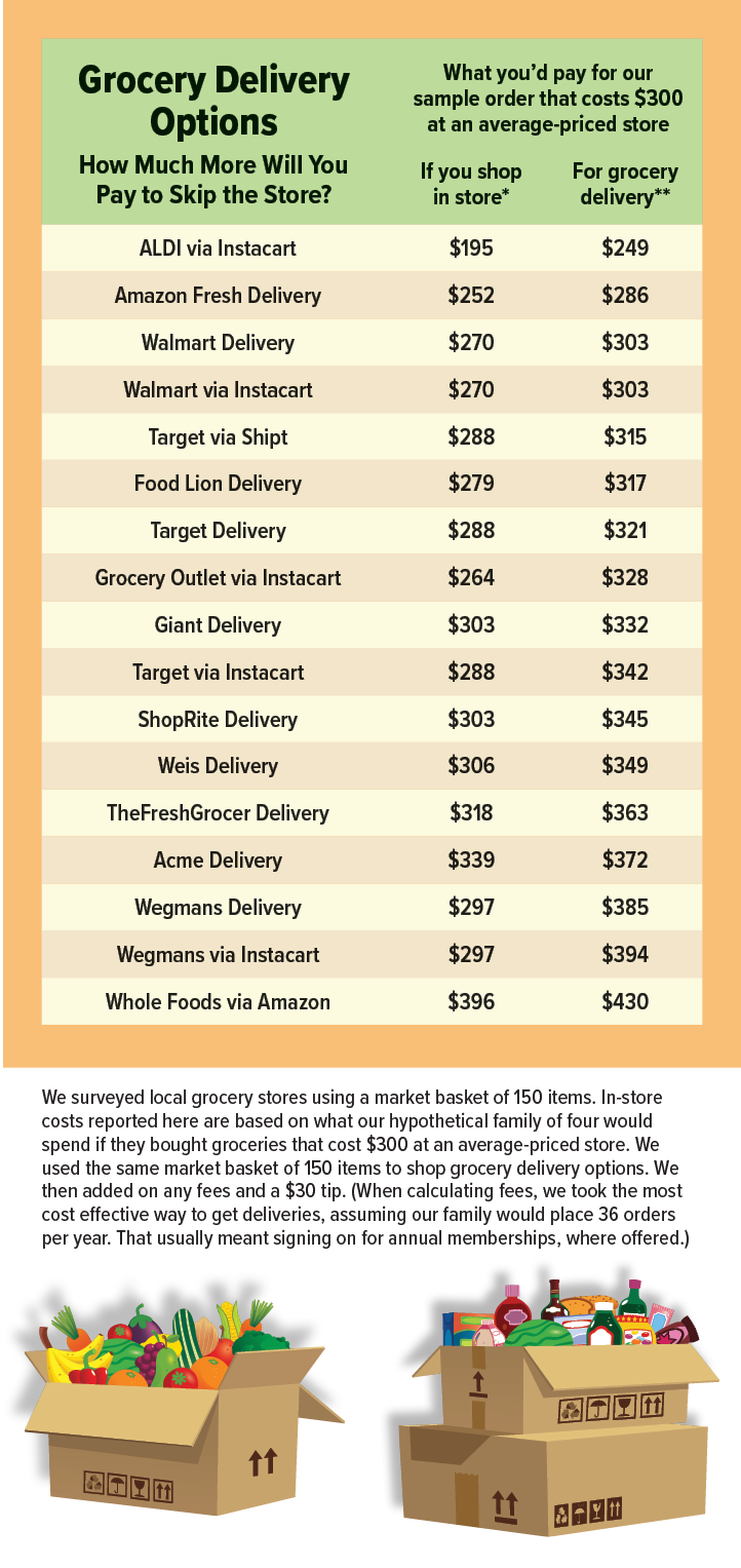 Some stores offer online ordering with at-store pickup. You still have to do the planning and list-making but you can check the quality of produce and meat before leaving the store. We didn’t price out these types of arrangements—we don’t have time to do everything—but several Checkbook staffers love this hybrid option.