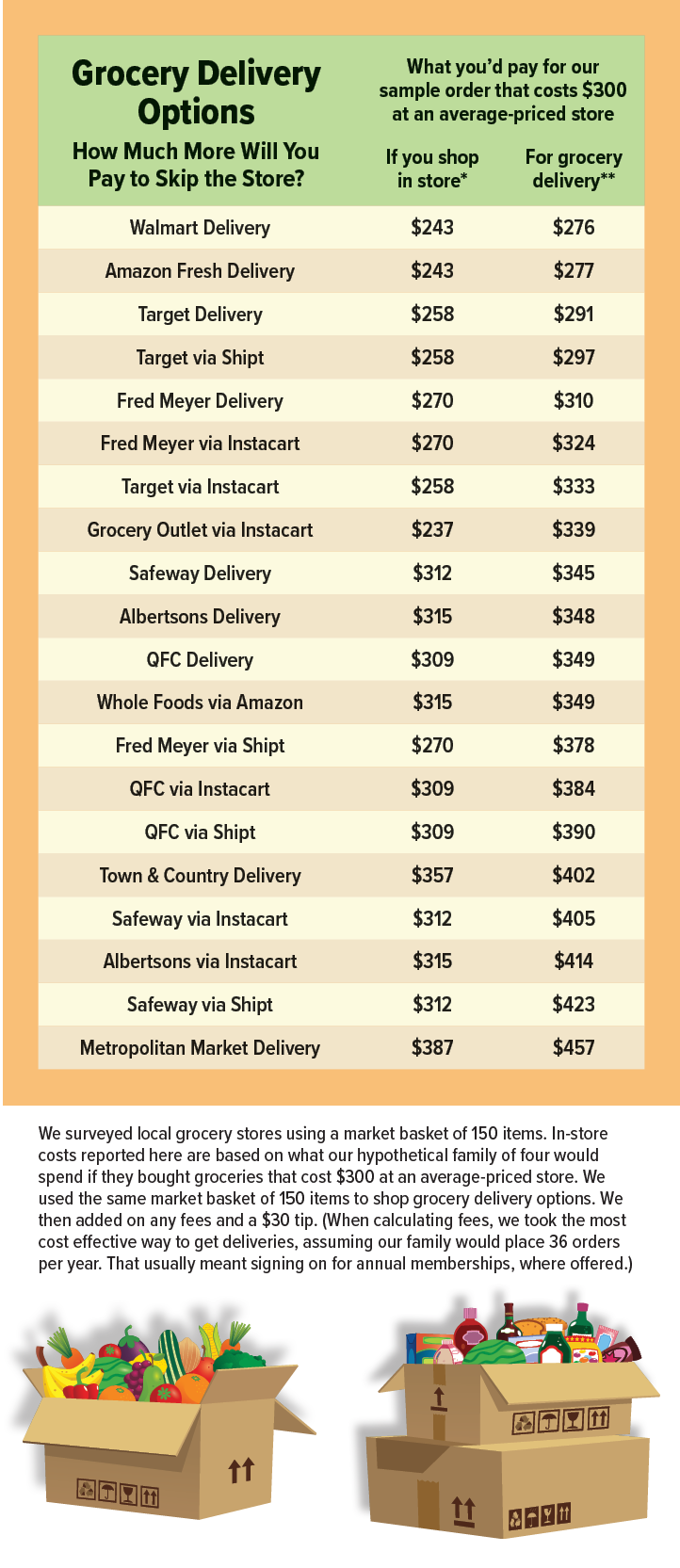 Some stores offer online ordering with at-store pickup. You still have to do the planning and list-making but you can check the quality of produce and meat before leaving the store. We didn’t price out these types of arrangements—we don’t have time to do everything—but several Checkbook staffers love this hybrid option.