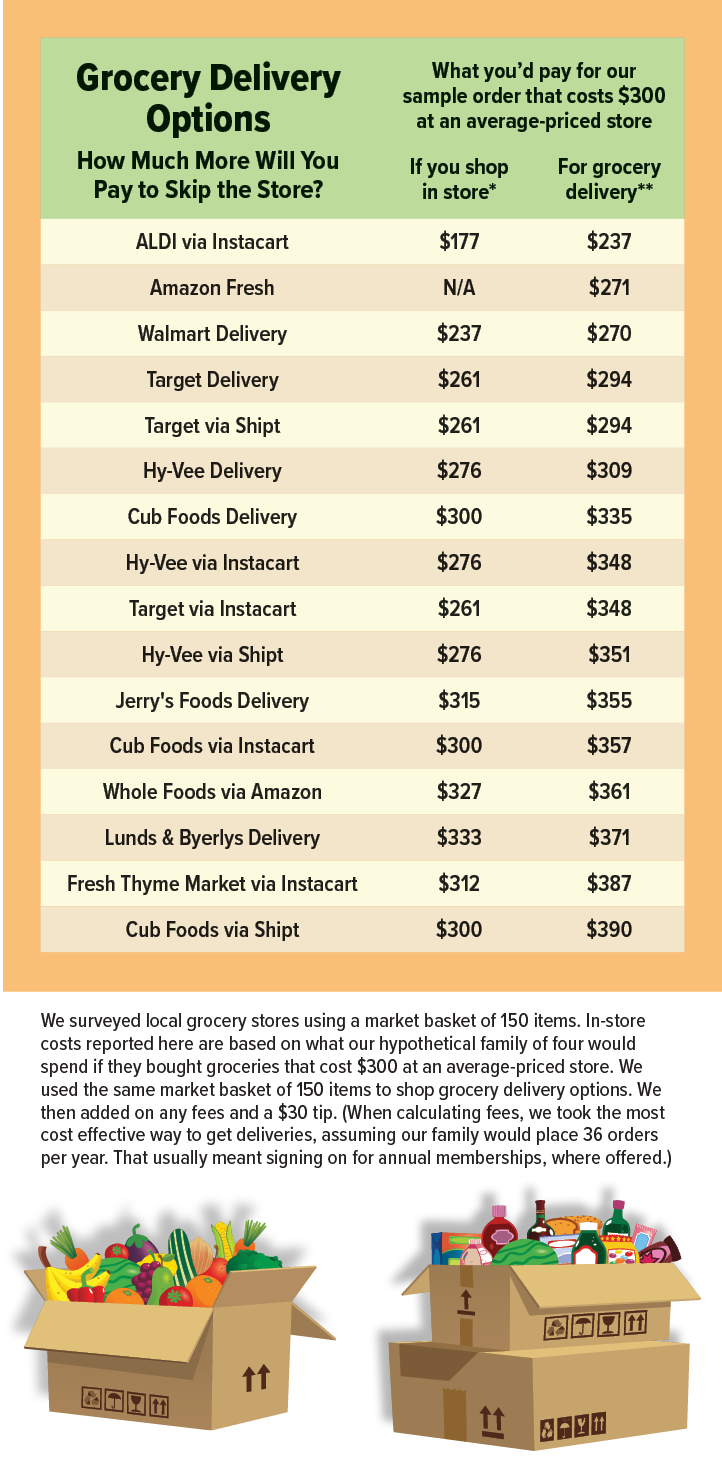 But with some delivery services, markups and fees added $40 or more to our totals. Our biggest cost increases usually were due to Instacart and Shipt charging steep markups on many stores’ prices. For our sample order, using Shipt to order deliveries from Cub cost us $60 more than what we’d pay in-store, plus tip; placing our order at Target via Instacart cost us $57 extra, plus tip; and we’d pay $45 more, plus tip, to have groceries delivered from Hy-Vee via Shipt or Fresh Thyme via Instacart.