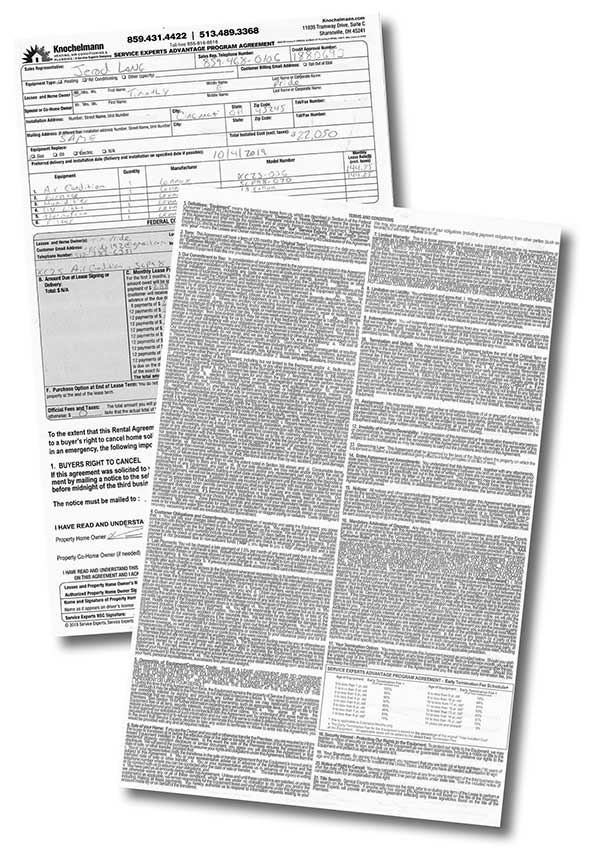 At the time of this writing, the website of the Better Business Bureau (BBB) reported having received more than 600 complaints against Service Experts in the past three years. For many of those complaints, the BBB’s website displays summaries of problems, as written by consumers. Many say that they unknowingly signed HVAC leases thinking they were getting a loan. And they frequently complain they weren’t told they won’t own the equipment after making payments for 10 years. Complainants often say that sales reps told them they were signing a maintenance-and-repair agreement, or “membership,” and that the word “lease” was never used.